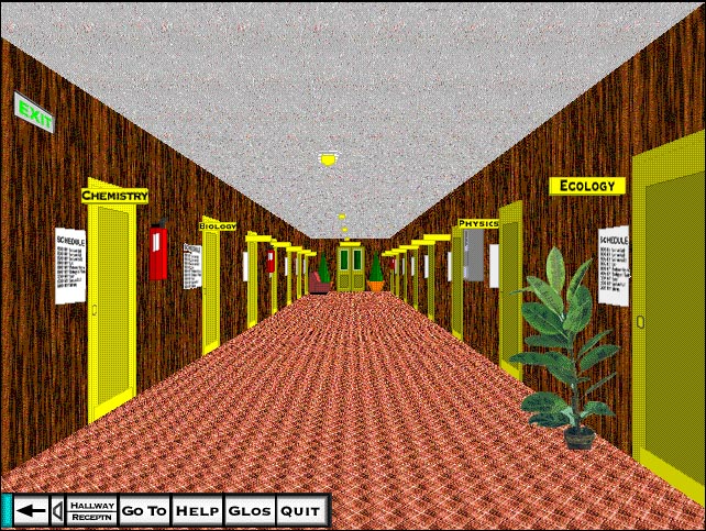 I did a fairly thorough prototype, using Chemistry as the first discipline to explore. The University was modeled in a Virtual 3D program and screen images transfered to Director. I used movies, interactive models, images of plants, etc, sound to simulate a real university environment. I was pretty proud of it. It was understood that the final CD-ROM would have better graphics. The company decided not to continue funding it pass the prototype stage because of internal problems and their uncertainly of the acceptance and profitablity of using CD-ROMS. Shame! I'd still like to do that one!