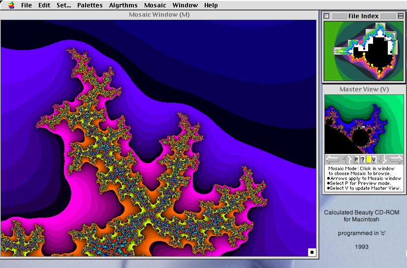Calculated Beauty was my first attempt at an interactive CD-ROM. It was a fun CD, meant for artists who loved computer generated art, and amateur mathematicians and scientists who liked exploring the mysteries of this simple yet exotic equation discovered by Benoit Mandelbrot. It was created when computers were still slow (1 mhz) and thus computing complicated formulas like the Mandelbrot equation was extremely time consuming. I computed several large mosaics of fractals over 6 months of time and stored the "counts" in a database on the CD-ROM. I wrote the large program in 'c' for the Macintosh (using the Macintosh toolbox!) to manipulate, colorize, sound, print and display these beautiful fractal images. Although by commercial standards the sales were poor, I got some press in national magazines and sold over a thousand of these over time. (For the Macintosh only.)