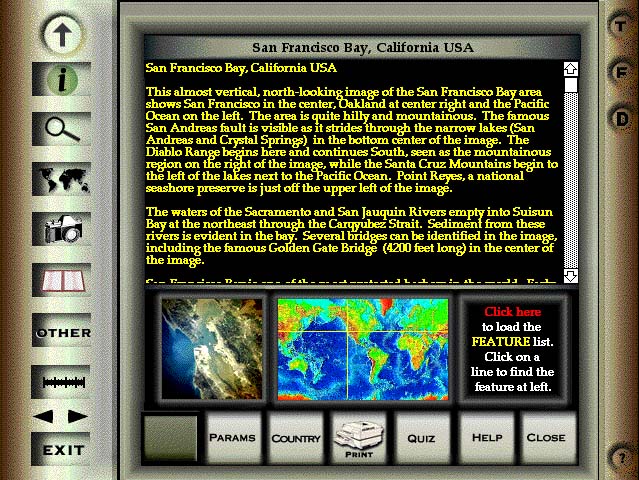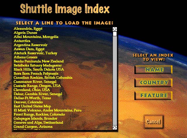 Since I had already done the CDROMS, STS59/68 which featured many low (screen size) resolution images of Earth from space, I wanted to show Earth in more detail. I selected about 80 images from NASA's Best of the Shuttle collection and used them to show off our planet. I was hoping that it would help people appreciate the beauty of our Earth and thereby develop a better sense of respect of the environment. I also wanted to provide a great resource for geography teachers for identifying important physical features of the Earth from space. As you move the cursor over a high-res image, the program pops-up the name of individual features.
