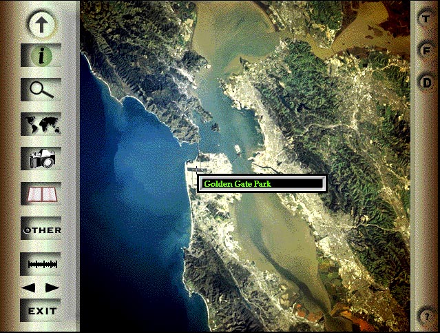 The program was written in Director with extensive use of Lingo for indexing and buffering images. By far the most time consuming effort in the almost two year self-funded project was the identification of the over 5,000 physical features in the images. I purchased maps from all over the world to do this (and probably still got some features placed wrong.) It also features still photos of important items in the pictures (from a ground perspective), descriptive text, and search capabilities. I composed the introductory music (with some help from my brother John). I think it was my best effort to date. Unfortunately, I ran out of both energy and money to try to distribute and sell it. I still have a lot of copies.