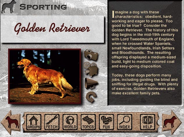 Multimedia Dogs and Cats was my first contract work in multimedia. Inroads Interactive had done a series of CD's featuring Dogs and Cats, with images, video, sounds, and text. They wanted to distribute them worldwide in the language of the country. Since most of the CD art was in Photoshop, they needed someone to redo all the screens and text in the target languages. Luckily, the foreign distributors provided the translation, but I had to redo pretty much every screen and text box in the CDs. The languages were French, Italian, Portuguese and German. (That was 8 CD's worth.) The program was Director again and I spent about 6 months part-time on this project. The most difficult part of the project was working with the foreign distributors, each with their own (characteristic) requirements.