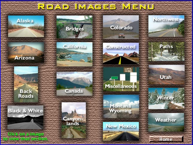 We spent the summer of 1999 touring the USA in our new motorhome and specifically took images of interesting roads. I thought these would make a great collection to be used in Web pages (a road in perspective speaks loudly to enter a page, or the excitment of travel), or multimedia ads, CD-ROMS, magazine ads, etc. I created an index using html code so this could displayed on the web. There are over 800 images. Now that I'm on the road full time, I'm planning to publish a Volume 2.