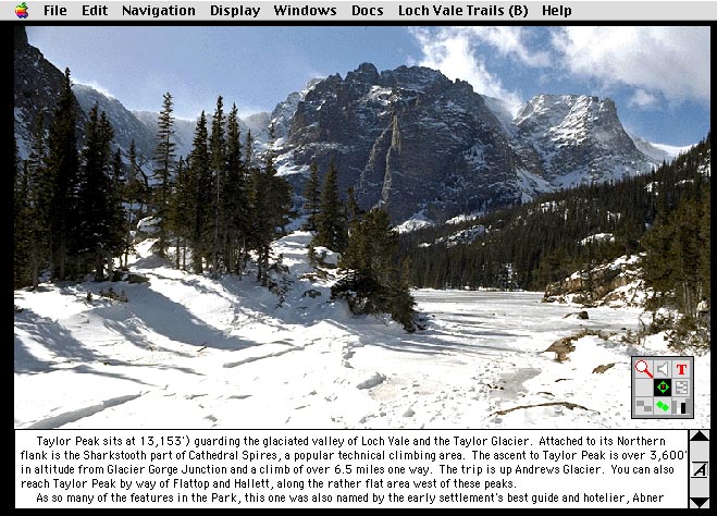 Virtual Landscape was designed to give the viewer an "immersive" experience in visiting a beautiful natural environment. I choose Rocky Mountain National Park since it was close to us. It was also winter, so I decided to try my hand at photography and snowshoeing! I spent three months doing the photography (I'd take 4 to 6 images at a spot on a trail, move on a few hundred feet and take another set. This was before QTVR was available.) I then spent about 6 months doing the programming in 'c' using the Macintosh Toolbox. I did the entire project myself and received good reviews in national magazines (Byte Magazine gave it 4 stars!). Unfortunately, it was programmed only for the Macintosh and that limited my market. I still lacked a good cross-platform tool.